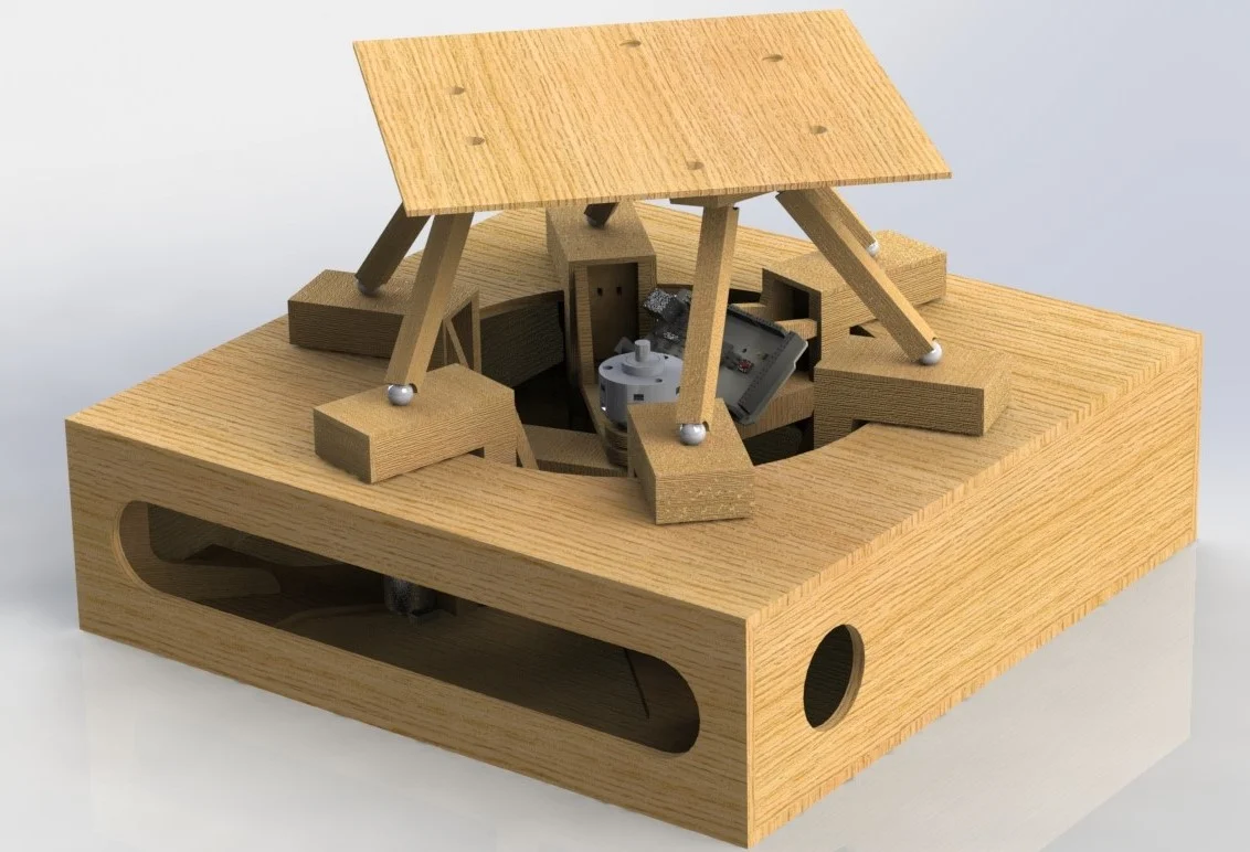 This project is being designed in Solidworks, coded using Matlab and Arduino, and is using motors with encoders for precise positioning of the platform. The platform is being built almost exclusively out of laser cut wood.